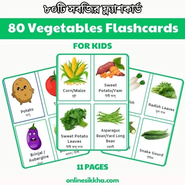 Online Sikkha » Bangla » Bengali Flashcards » 76 Vegetables Flashcards for Kids in Bengali and English